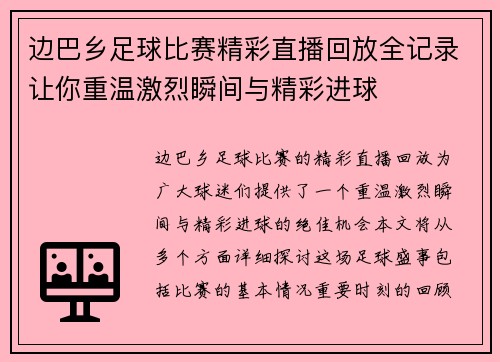 边巴乡足球比赛精彩直播回放全记录让你重温激烈瞬间与精彩进球